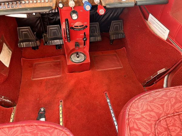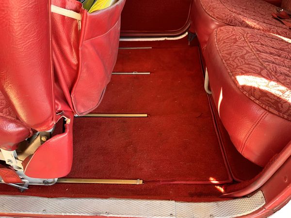 Maroon fabric and vinyl seats with matching side panels. Hard headliner. All in good condition. Overall rated 8 out of 10.