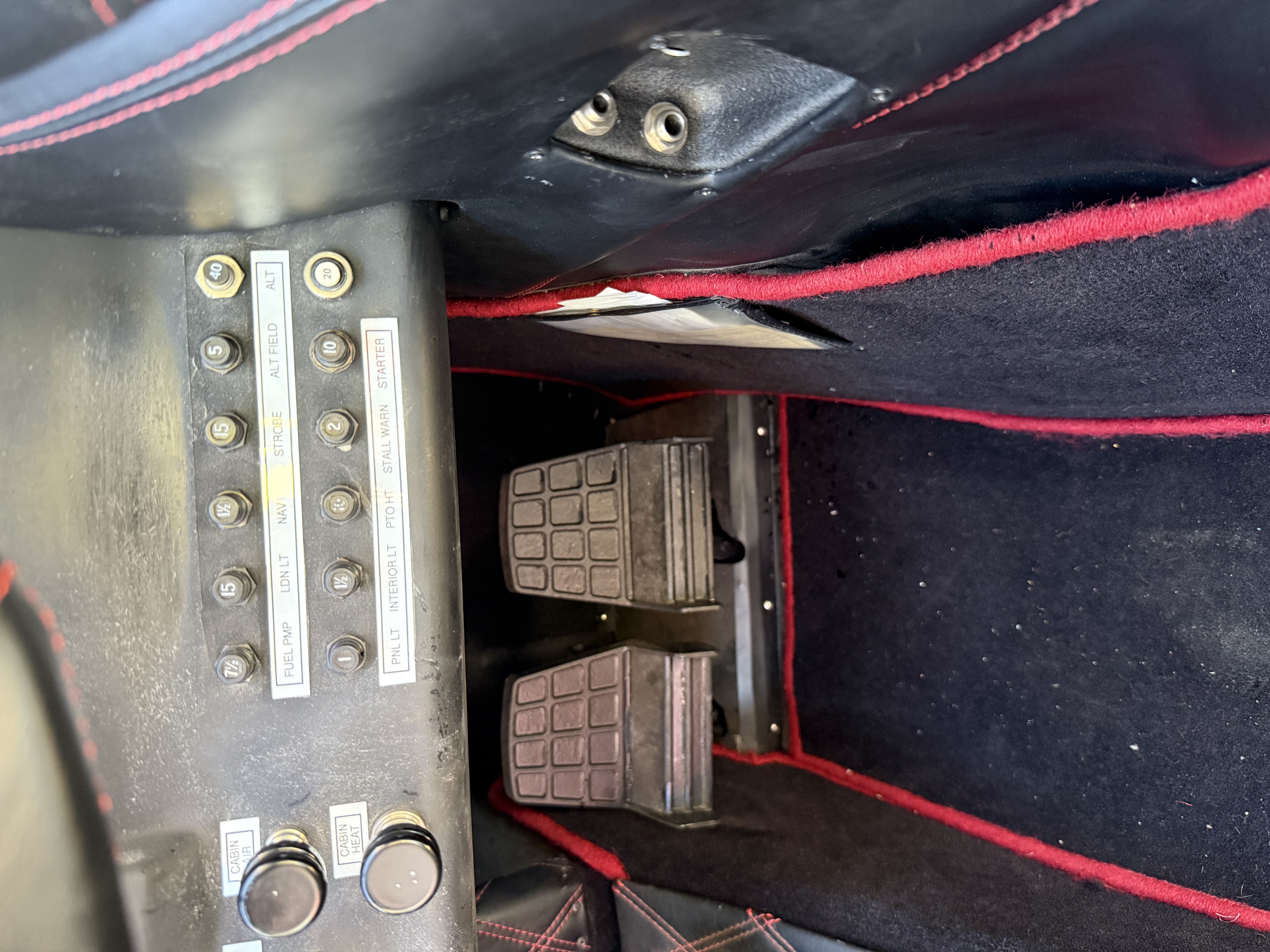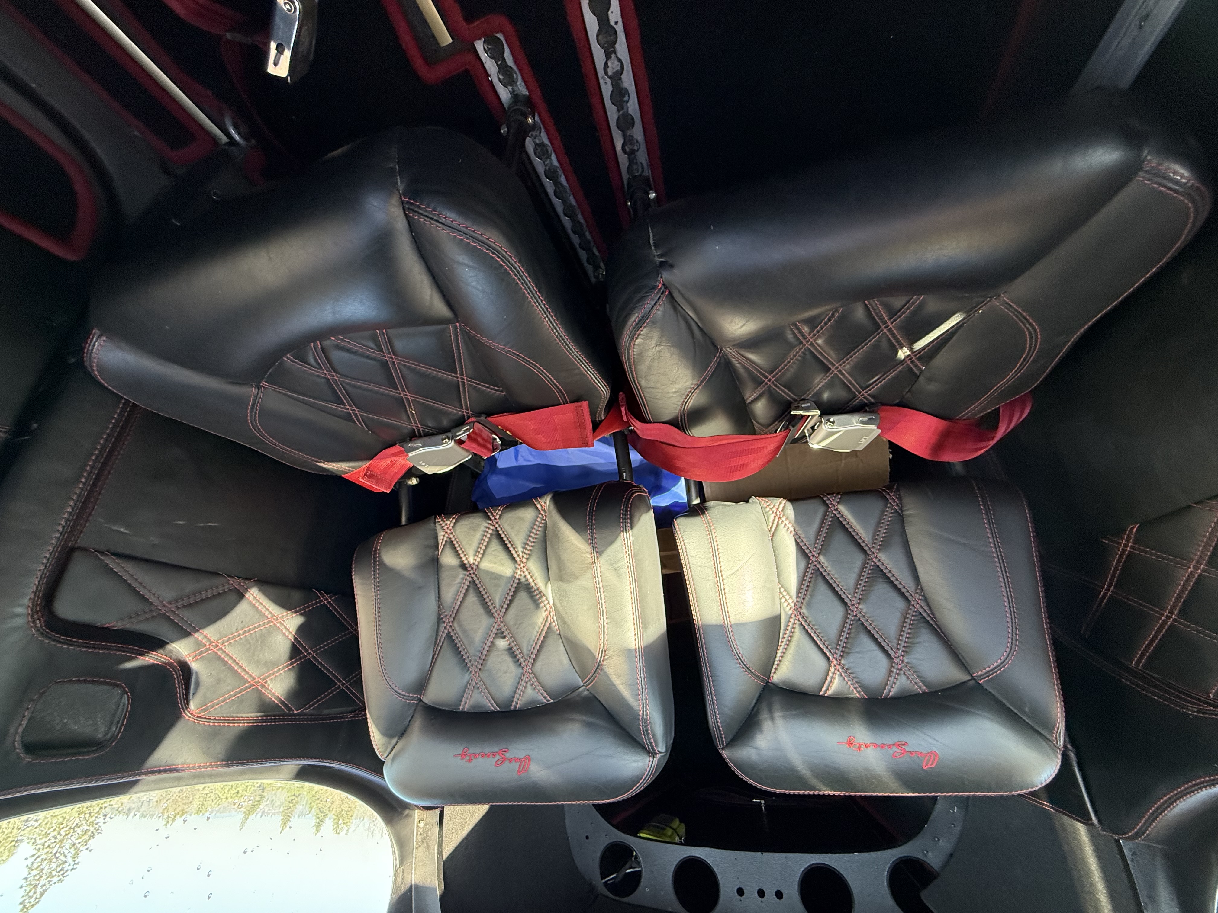 Custom deluxe black leather over NASA foam with red piping and stitching. Matching side panels and carpets. Very good with some minor wear. Overall rated 8 out of 10.
