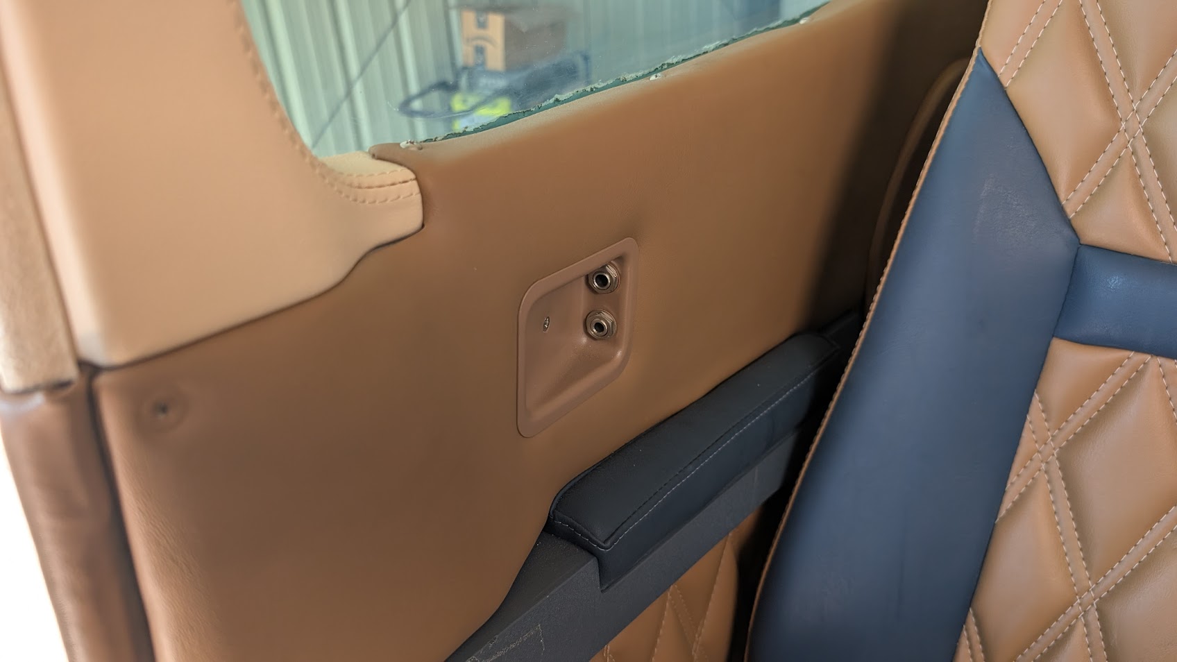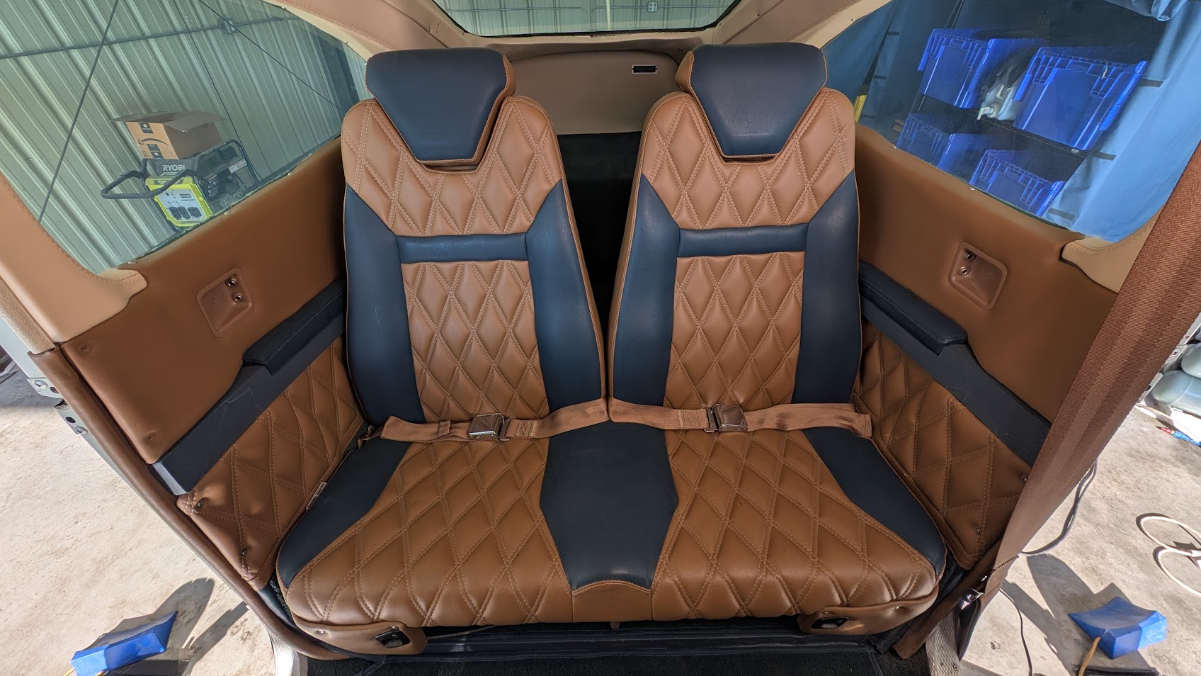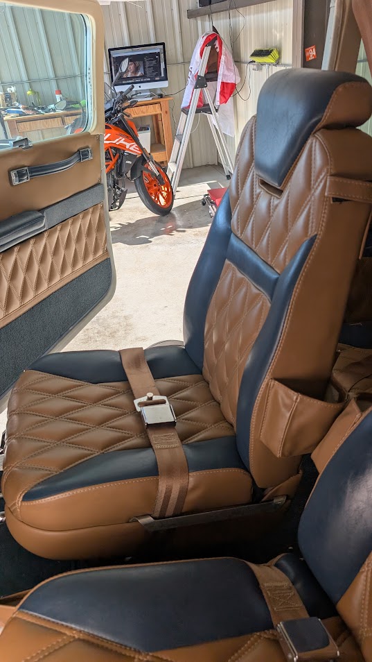 INTERIOR. Tan and blue custom leather seats with matching side panels. Blue carpet and cream headliner. Overeall rated 8.5 out of 10.